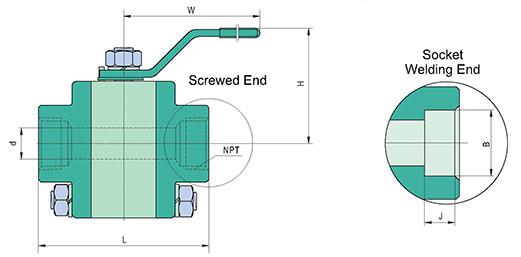Features:Size: 1/2"~2" (DN 15 - 50 mm).Class: 800/1500/2500.Three Pieces Forged Steel Body.Floating Ball, Full Bore.Anti-Static Device.Screwed and Socket Welded Ends.Blow-out Proof Stem.Standard:Design: ASME B16.34/BS 5351.Face to Face: Manufacturer Standard.End to End: Manufacturer Standard.Threaded End: ASME B1.20.1.Socket Welding & BW End: ASME B16.11.Test: API 598/BS 6755.Fire Safe Test: API 597/API 6FA.Part Material: LF2/316NACE1. Adapter: ASTM A350-LF2.2. Body Bolt: ASTM A320-L7M.3. Spring Washer: Stainless Steel.4. Body Nut: ASTM A194-4.5. Body: ASTM A350-LF2.6. Seat: PTFE.7. Ball: ASTM A182-316.8. Stem: ASTM A276-316.9. Thrust Washer: PTFE.10. Stem Packing: PTFE.11. Gland: ASTM A276-316.12. Stop Plate: Carbon Steel.13. Stop Pin: Stainless Steel.14. Spring Washer: Stainless Steel.15. Lever Nut: ASTM A194-7M.16. Lever: Carbon Steel.17. Antistatic Spring: Stainless Steel.Dimension & Weight